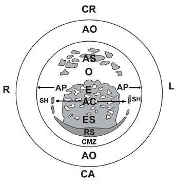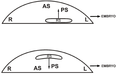 R: right and L: left side; CR (cranial) and CA (caudal region); RS: median-part of Rauber- Koller’s sickle, the earliest organizer; SH: sickle horns; E: endophyll; ES: endophyll in which sickle endoblast derived from RS has migrated cranially; AS: anti-sickle region formed by upper layer (UL) in which no RS material is present, but remnants of yolk masses or cell groups; O: region where only the deep side of the UL is visible; AC: area centralis in which neuro-gastrulation phenomena take place, encircled by median RS and lateral SH; AP: area pellucida (borders indicated by horizontal arrows); CMZ: caudal marginal zone in which after incubation blood islands (area vasculosa caudalis) will develop; AO: area opaca.