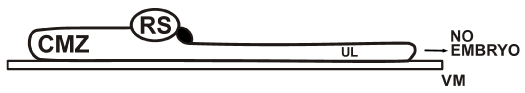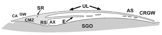 Figure 1B. Schematic medio-sagittal section through an unincubated chicken blastoderm after fixation in situ and in toto on the egg yolk ball. Note that the caudal marginal zone (CMZ) and Rauber’s sickle (RS) are in permanent contact with the caudal subgerminal ooplasm; in the anti-sickle region (AS) and below the cranial germ wall (CRGW) this is not the case since there an open narrow space exists; SR: “Sichel Rinne”; AX: axilla, caudal part of the subgerminal space, enclosed between the blastoderm and the subgerminal ooplasm (SGO).