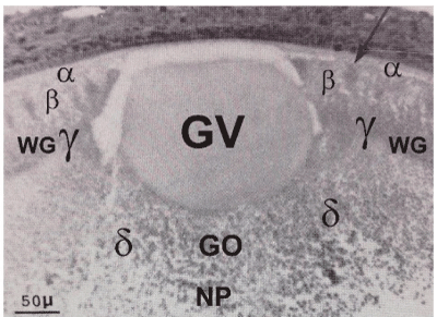 Figure 2A. Low power view of the germinal vesicle (GV) and the four surrounding ooplasms (α-,β-,у-,δ-) in a quail oocyte of 5,5 mm diameter; t.i.c.o’s (indicated by arrow) are seen in the β-ooplasm; у-ooplasm localized in the Wedge granules layer (WG); δ-ooplasm is seen in the superficial part of nucleus of Pander (NP); the presumptive germinal ooplasm (GO) giving rise to ooplasm in the PG Cells is localized in the central δ-ooplasm of the nucleus of Pander, below the deep pole of the germinal vesicle (endoplasmic cone probably derived from the Balbiani complex material).