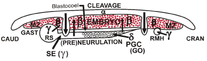 This central zone (area centralis) is surrounded by a box-like ooplasmic zone, where “extra-embryonic” ooplasms (α-, у-and δ-) play an inducing and mechanical shaping role during early patterning of the embryo. During the cleavage period, the most superficial and mobile α-ooplasm (cortex) forms, temporally a cover over the embryonic blastomeres.