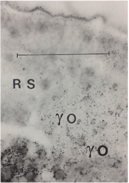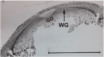 Figure 2C. Autoradiography of a section through the germinal disc region of a quail oocyte (14 mm diameter), 3 days after an injection of ᶟH-leucine to the mother; the arrow indicates labeled yolk in the Wedge granules layer(WG); GO: presumptive germinal ooplasm region localized below the deep pole of the germinal vesicle in the nucleus of Pander, encircled and domed by the Wedge granules layer. Bar = 1mm. [45]