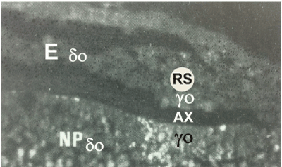 Figure 4B. Combined schematic drawing of a medio-sagittal section through a quail post-lampbrush oocyte compared with the derived blastoderm after symmetrization: the oblique split represents the spatially unequal formation of the subgerminal space resulting in the spatial oblique uptake in the deeper caudal half of the blastoderm of у-ooplasm (RS) and δ-ooplasm, forming the endophyll (E) in the future caudal region of the blastoderm. The oblique formation of the split explains why RS and endophyll are fixed together in one plane. G: presumptive localization of primordial germ ooplasm.