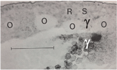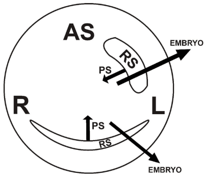 Diametrically opposed to the Rauber’s sickle region we see the anti-sickle (AS) region in which isolated fragments of deep layer cell-groups or yolk masses are localized close to the neighboring upper layer (UL). In the anti-sickle region, the upper layer (UL) extends loosely over the underlying yolk mass. In the caudal Rauber sickle region, the Rauber sickle (RS) is fixed in continuity to the underlying subgerminal у-ooplasm, forming an axilla-shaped (Axilla) part of the subgerminal cavity, but also the Rauber sickle region adheres to the overlying upper layer (UL) usually forming a superficial sulcus [21] (Figure. 1B). This adhesion can have been demonstrated by radioactive labeling of the y-ooplasm (Figure. 4A).