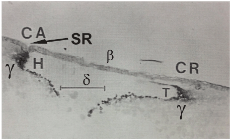Figure 4A. Autoradiograph of a medio-sagittal section through an unincubated quail blastoderm, laid five days after a maternal injection of ᶟH- tyrosine. The separation of the cranial part (CR) of the blastoderm from the underlying hook-shaped labeled y-ooplasm (T) is clearly seen, whilst in the caudal part we see the adhesion of the labeled у-ooplasm to the neighboring part of the upper layer, forming a peripheral sulcus, SR (called “Sichel Rinne” by Koller [21] in the Rauber’s sickle region, where later the caudal area vasculosa will develop very superficially below the upper layer. In contrast, in the more cranial region the heart tubes will develop in the deeper part of the blastoderm, containing labeled у-ooplasm (sickle horns). This local different distribution of the y-ooplasm seems to predetermine the local differentiation of the coelomo-cardiovascular system.