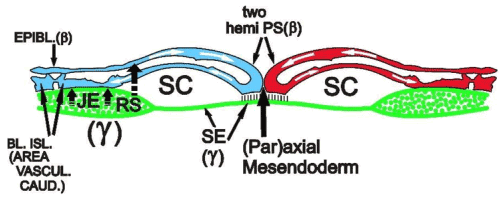 Figure 5B. Interaction between у- (green colour) and β-ooplasm-containing cell lineages, during gastrulation and caudal area vasculosa formation: schematic representation of a section through the caudal part of Figure 5A, showing the sliding (indicated by white arrows in the median region) forming two parallel hemi-PS’s (left and right) which will migrate laterally in the roof of the sickle canal (SC) to form blood islands and coelomic vesicles in the neighborhood of the junctional endoblast (JE); two short vertically directed arrows indicate the inducing effect of the junctional endoblast (JE) on blood island formation (BL.ISL); long the interrupted arrow, starting from the RS and pointing to the epiblast (UL), indicates the start of the induction of mesoblast by Rauber’s sickle; SE: sickle endoblast, which induces the (par)axial mesendoderm.