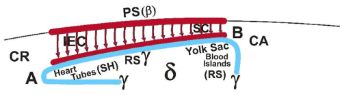 A. A cranially directed bilateral and deeply localized blood pumping system, forming the primary heart tubes in close association with the Rauber sickle horns [22]. It has been shown by various workers [69-71] that the presumptive heart mesoderm in the chick lies, as two separate areas on either side of the head process. The movement of the presumptive heart cells into their correct situation and ordering has been described by De Haan by the marking with particles of iron oxide of the undifferentiated splanchnic mesoderm [72-74]. Also Lopez-Sanchez et al. found that the primary heart tubes are derived from mesoblast cells ingressing according to a cranio-caudal order through the cranial part of the primitive streak [75]. There upon, according to De Haan and Bellairs, the heart and pericard precursor cells migrate through the intraembryonic cavity at a distance from the epiblast [74,76]. De Haan also describes that clusters of precardiac cells migrate more actively over an endodermal substrate which seems to correspond to the junctional endoblast (RS horns), we described here (Figures 5C, 5D).