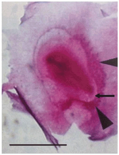 Figure 5E. Demonstration of the spatial continuity of the right lateral area vasculosa (lateral arrow head) and the caudal area vasculosa (caudal arrow head) in direct relationship with the spreading of the Rauber’s sickle material, by in toto staining with Unna of an avian blastoderm after 28 h of culture, from which at the unincubated stage the left sickle horn region was taken off; the arrow indicates the transparent sickle canal roof in the concavity of the caudal area vasculosa.
