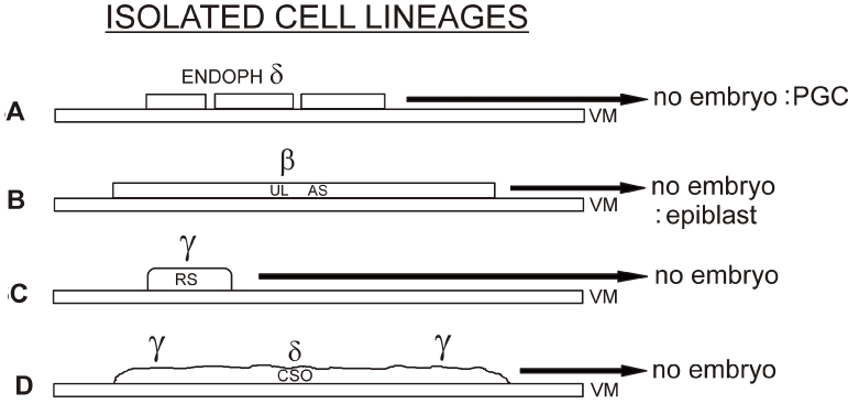 Figure 6D. After culture on a vitelline membrane (VM) of a central subgerminal ooplasmic mass, containing δ-ooplasm surrounded by equatorial у-ooplasm, no embryo develops.