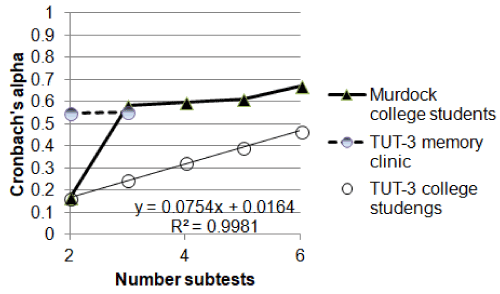 Figure 2. Cronbach’s alpha as a function of subtests for the 3-item TUT tests of college students [7], the 3-item TUT test on an old population [8] and using the data from the classic Murdock 10-2 free recall test [5].