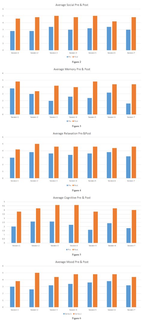 This study collected both objective and subjective data which includes data from each sessions average score from pre and post questions along with verbal responses. The data from the pre and post questions were collect at the beginning and end of each session. It was based off a five point Likert Scale, five being the highest and 1 being the lowest. The pre session questions involved one social question: 1) How would you rate your daily interactions thus far? , one memory question: 1) Did you recall any memories from your past today? , a relaxation question: 1) How relaxed are you right now? , a cognitive question: 1)Have you learned something new today and one mood question: 1) How has your mood been today?. The post-session questions also involved one social question: 1) How would you rate your daily interactions thus far now? one memory question: 1) Did this activity bring up any old memories?, a relaxation question: 1) How relaxed are you after this activity?, one cognitive question: 1) Did this activity make you learn something new?, and one mood question: 1) How is your mood after this activity?. This is a qualitative study without the use of a control group. The data collected supports previous studies and findings within the field of Therapeutic Recreation along with the objectives of the TTAP Method® (Table 2).