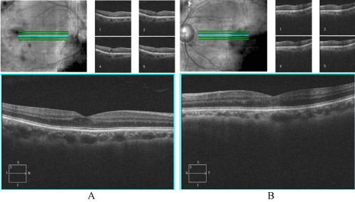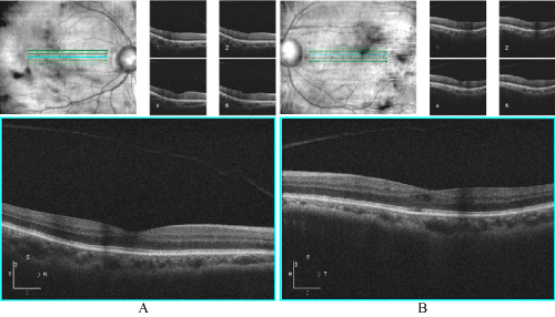 Figure 3. HD 5-line raster with cross-section through macula A) Right eye: normal foveal contour B) Left eye: mild cystic space superior temporal to fovea.