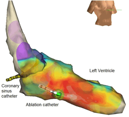 Figure 2. Three-dimensional mapping using EnSite™ NavX™ mapping system. Ventricular tachycardia originates at the site of left ventricular posterior papillary muscle implantation.
