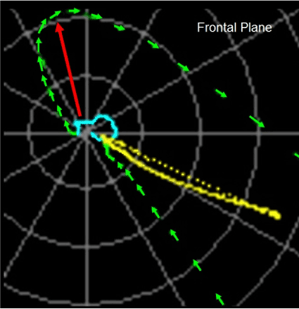 Figure 3. VCG performed after successful ablation of the left posterior fascicle. The QRS loop (in green) has clockwise rotation and the initial forces are oriented upwards and to the right (red arrow). These initial forces correspond to the normal septal activation from left to right.