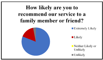 In addition, 97% of patients asked stated they were likely or extremely likely to recommend the service to a family member or friend in a similar situation, with the remaining 3% stating that they were unlikely to recommend the service.