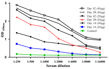 Figure 2. Immunized mice blood analysis for IgG titres against the 20µg and 40µg of immunizing protein. The Figure displays the absorbance values (OD450) at 2 fold serial dilutions of the sera and the absorbance value at the highest dilution tested (1:16000) at days 14, 28, and 42. Sera from mice in each immunization group (n=6) were assayed in triplicate at each timepoint. The adjuvant control group (n=6) were assayed at the last timepoint