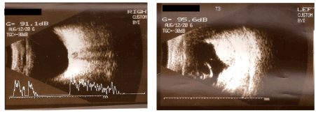48-year-old man was admitted during emergency because of bilateral OGI; car window cut both eyeballs and skin of nose. On admission: Vod = hand motion(HM) Vos = questionable light perception(LP). Oedema, haematoma and small wounds of upper lids. Right eye (RE): Congestion of conjunctiva. Cornea with horizontal wound in the central part and vertical at the nasal part of limbus. Hyphema. No possibility to examine other eye structures. Left Eye (LE): Congestion of conjunctiva. Cornea with horizontal wound in the central part and prolapsed iris and vitreus. Intraocular haemorrhage. No possibility to examine other eye structures. Ultrasound examination (USG) revealed: RE: no pathologies with lens and posterior eye segment. LE: lack of lens, intraocular and subrerinal haemorrhages (Figure 1).