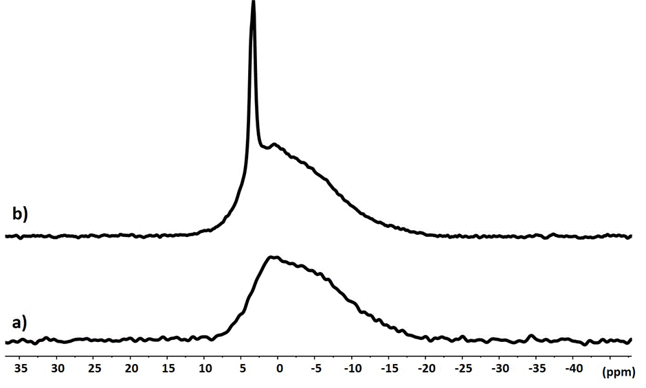 In the presence of zirconiae, there is a clear difference with a new sharp signal at 3.5 ppm (Figure 1b). This signal shows significant chemical shift anisotropy observed on the 3 kHz low-spinning frequency MAS experiment. The signal sharpness is therefore explained by the presence of a new crystalline phase in the presence of zirconia particles. It can be assumed that this phase forms on the surface of the zirconiae (Figure 3).