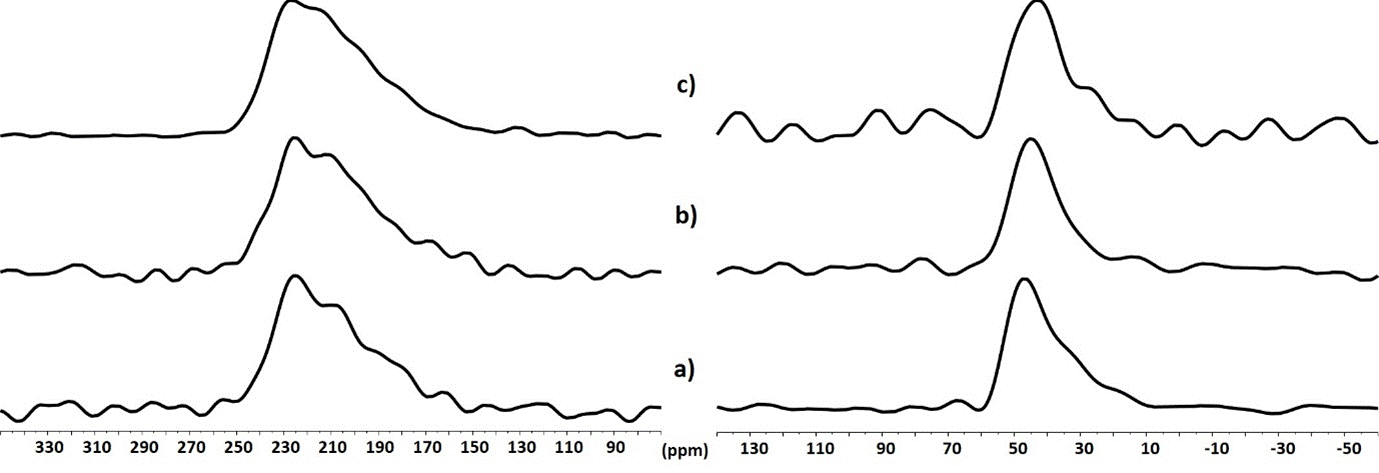 Figure 8. (left) 67Zn and (right) 25Mg QCPMG (echos summed) NMR spectra of cement powder (a), cement powder after addition of the phosphoric acid solution in absence (b) and in presence (c) of zirconia